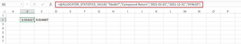 =ALLOCATOR_STATISTICS_VALUE( [Text] ID, [Text] Metrics, [Date] Start Date, [Date] End Date, [Text] Benchmarks, [Text] Benchmarks, [Text] Benchmarks, [Text] Benchmarks,….)