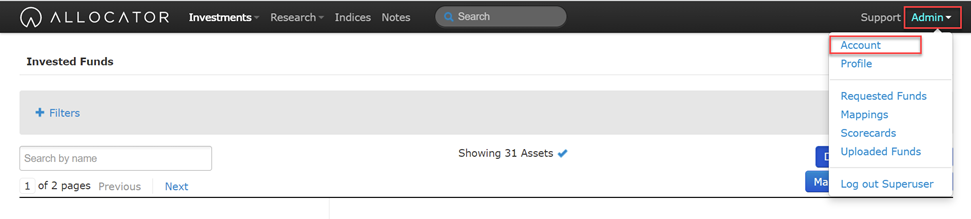 Select the ‘Admin’ button in the top right hand corner, and select ‘Account’.