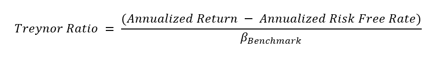 The Treynor Ratio, also known as the Reward to Volatility Ratio measures the return generated in excess of a riskless investment (measured by the risk free rate), per unit of market risk (measured by the beta of the benchmark).